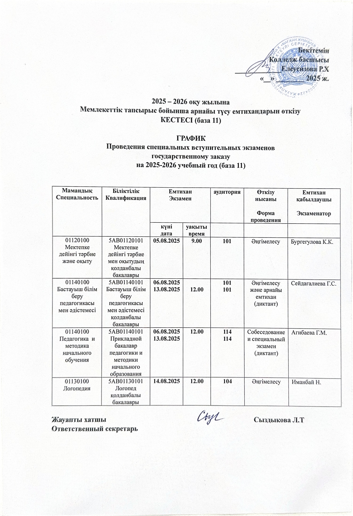 2025-2026 оқу жылына Мемлекеттік тапсырыс бойынша арнайы түсу емтихандарын откізу кестесі (база 11)