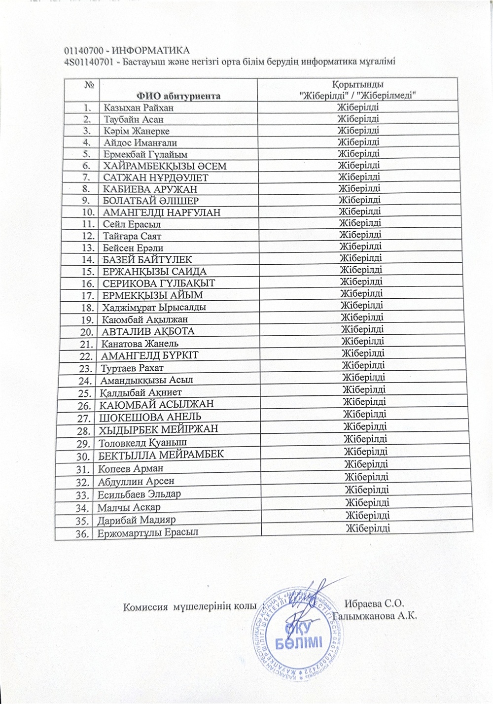 Результаты экзаменов по специальности 01140700 «Информатика» квалификации 4S01140701 «Учитель информатики начального и основного среднего образования»