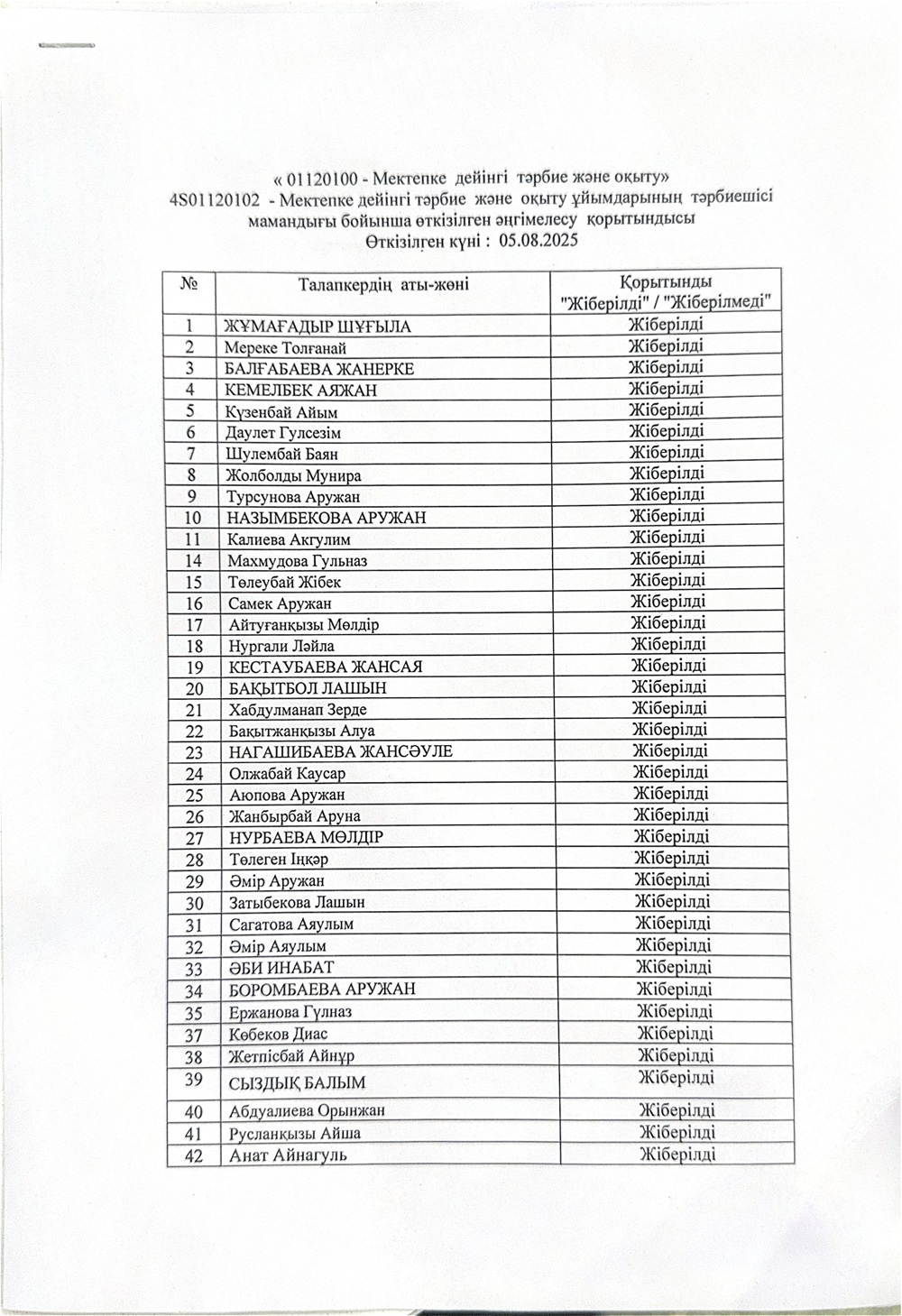 Результаты экзаменов по специальности 01120100 «Дошкольное воспитание и обучение» квалификации 4S01120102 «Воспитатель организации дошкольного воспитания и обучения»